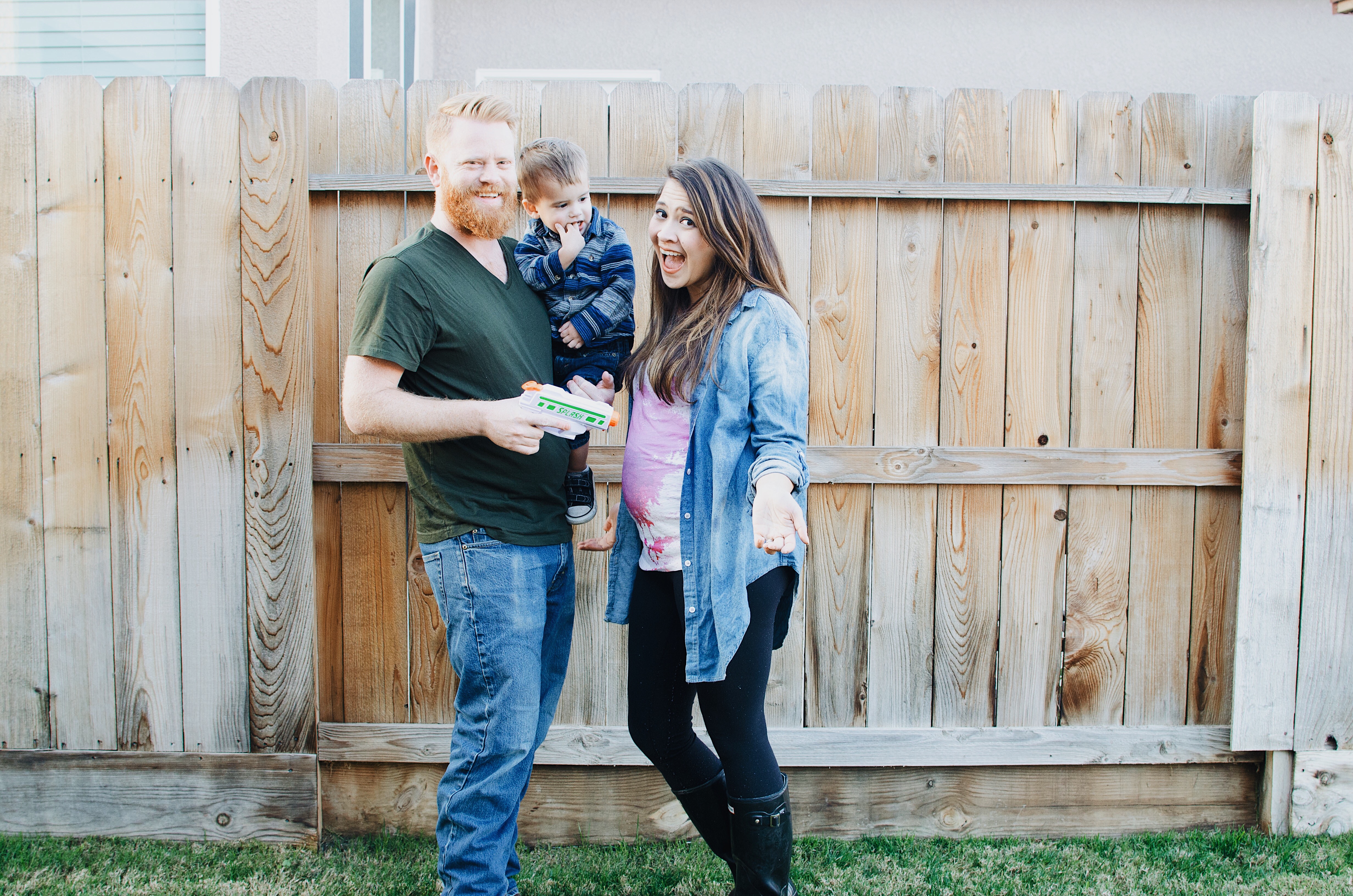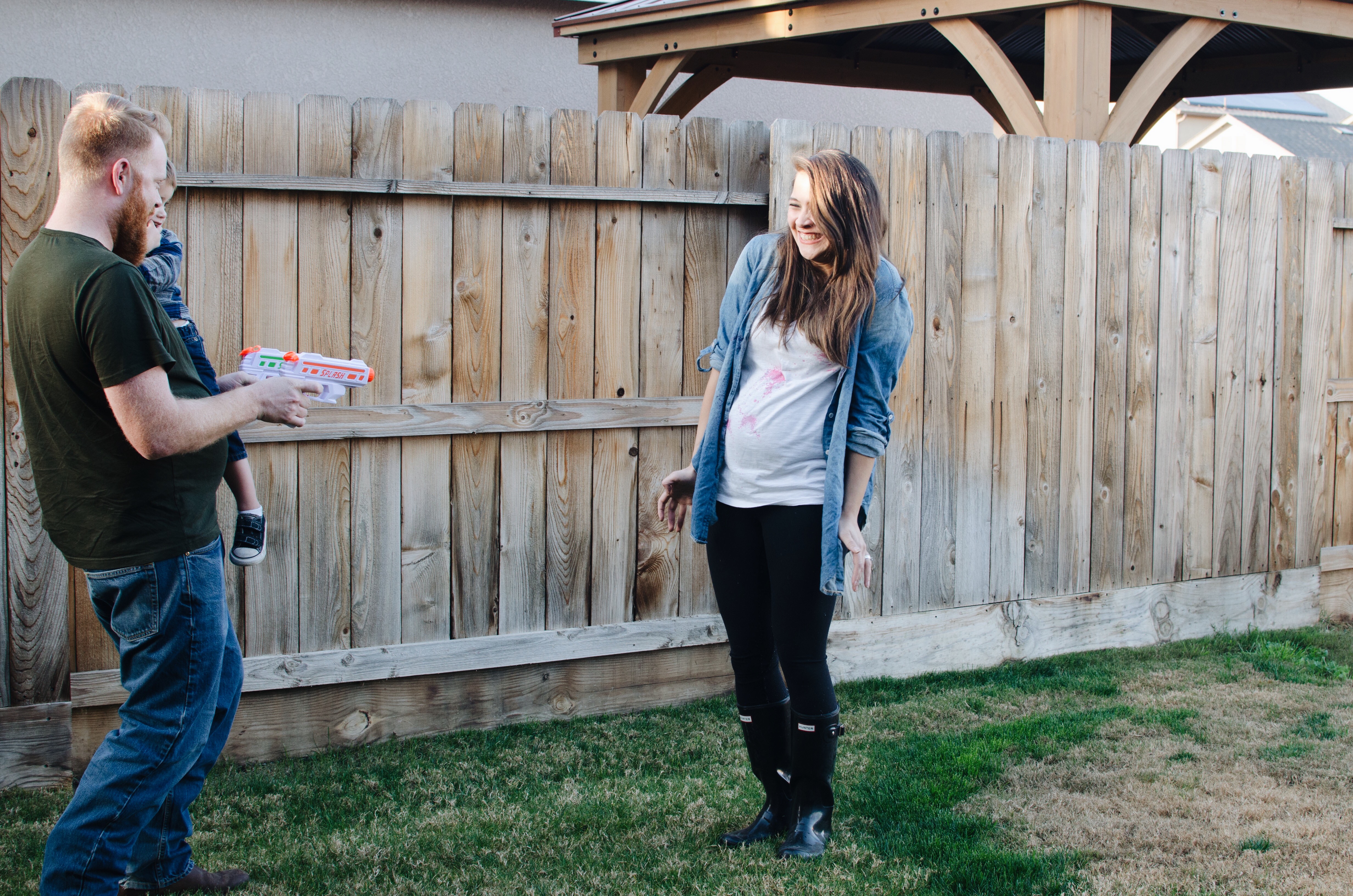 We set everything up in the backyard. Brady and Rowan were armed with water guns, and I wore a white t-shirt, leggings, an old denim shirt, and rain boots.